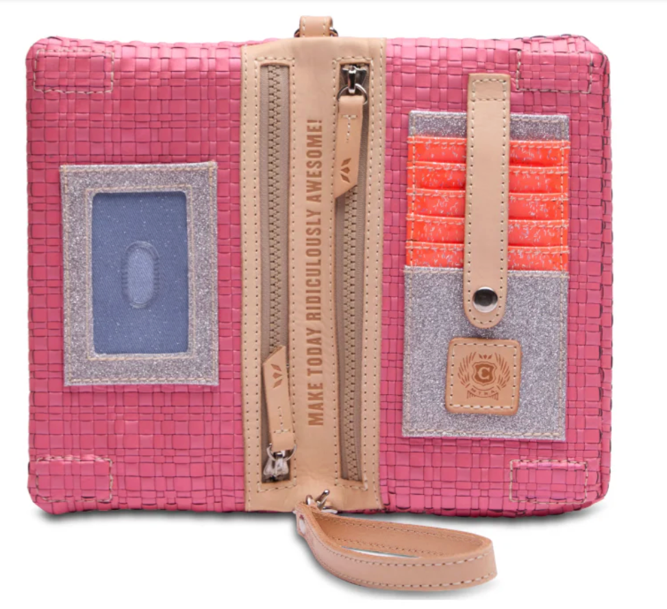• Included detachable wristlet strap and adjustable woven crossbody strap