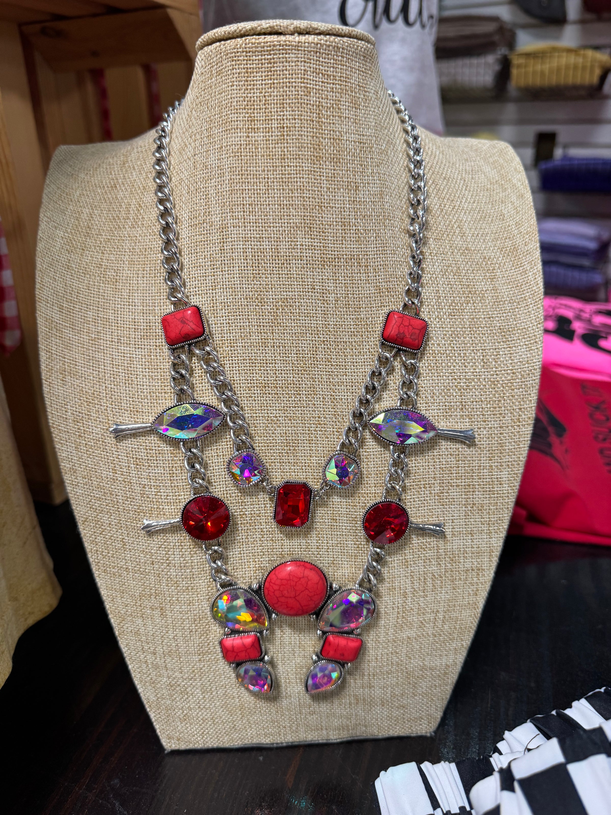 Inspired by the iconic squash blossom motif, the Desert Flame Necklace blend tradition with fire. Bold red stones and shimmering crystals radiate warmth and strength, echoing the fiery sunsets of the Southwest. This statement necklace celebrates heritage with a modern edge—perfect for those who wear their roots and passion with pride.
