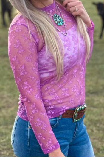 Brighten up your wardrobe with the Purple Skies Lace Top. This cute and stylish top features delicate lace mesh, making it perfect on its own or layered under a stylish tee. Add a touch of charm to any outfit with this must-have piece.