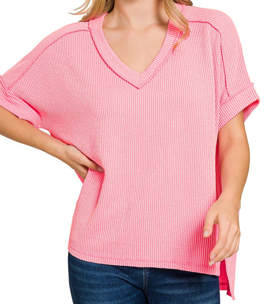 Raised rib short sleeve hi-low v neck top