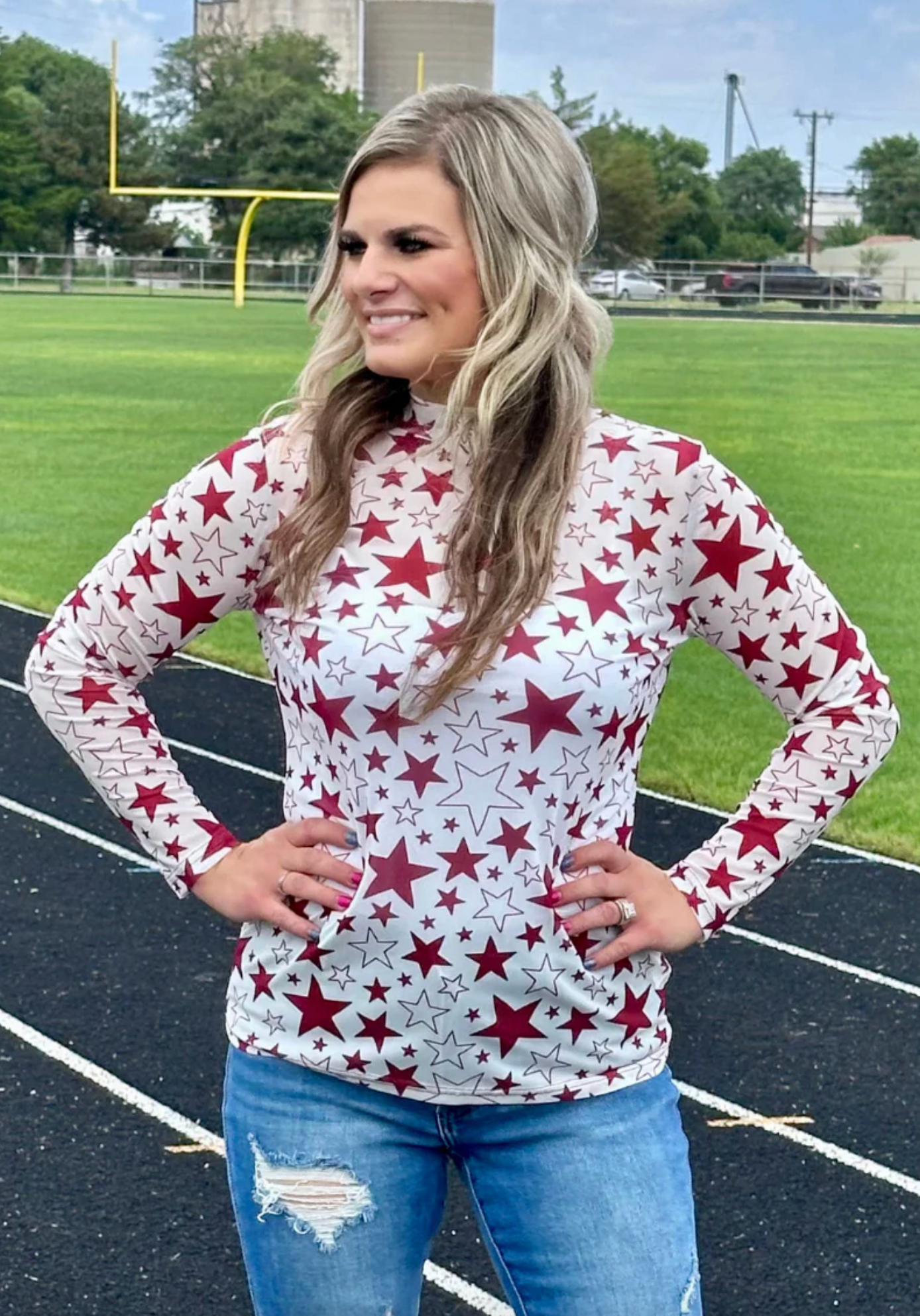 Show your team spirit with this playful white mesh top adorned with bold maroon stars. Lightweight and breathable, it’s perfect for cheering on your favorite team in style and comfort. Whether at the game or out with friends, this top adds a fun, spirited touch to your outfit.
